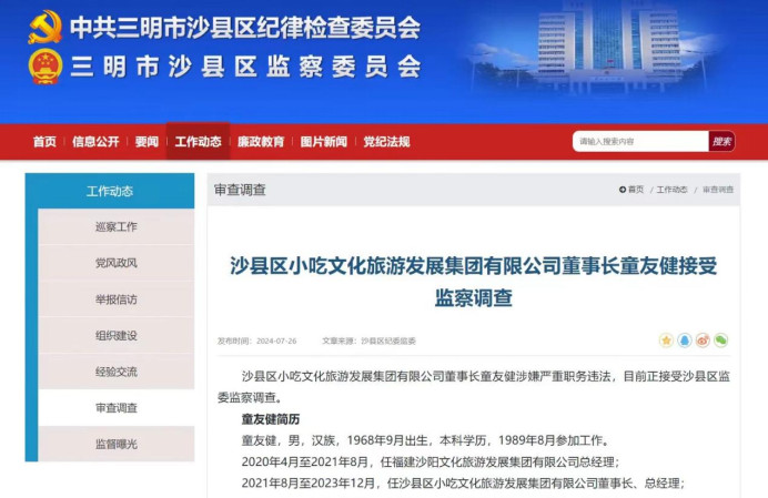 大公快消讯 7月26日,福建省三明市沙县区纪委监委消息显示,沙县区小吃文化旅游发展集团有限公司(以下简称“沙县小吃文旅集团”)董事长童友健涉嫌严重职务违法,目前正接受沙县区监委监察调查。