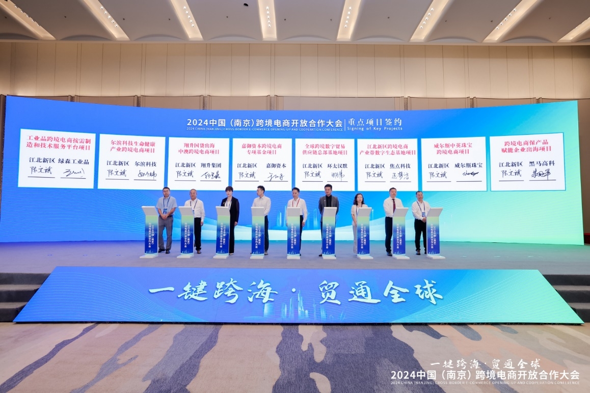 据悉,本次会议,南京市商务局发布了江苏省首个跨境电商全场景业务服务软件“一键出海HUI享跨境数字化综合服务平台”,江北新区和建邺区也分别发布了长三角工业品跨境电商选品中心和跨境电商数据集成展示与应用中心。同时,会议上启动了南京都市圈+跨境电商产业带“扬帆”行动,以及江苏高校“丝路电商”领航人才计划,并在现场进行了多项重大项目签约,共绘跨境电商蓝图,为全国跨境电商产业注入了强劲动力。焦点科技股份有限公司(以下简称“焦点科技”)副总裁迟梦洁受邀出席大会并参与江北新区跨境电商产业带数字生态集群项目的签约。