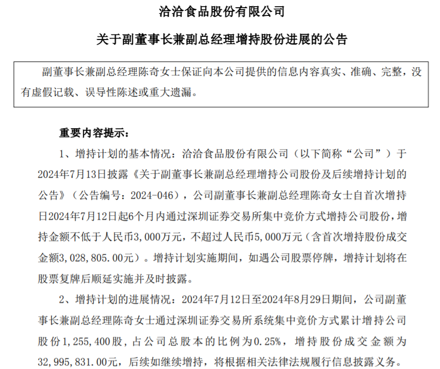 近日,洽洽食品股份有限公司(证券代码:002557,证券简称:洽洽食品)发布公告称,2024年7月12日至2024年8月29日期间,公司副董事长兼副总经理陈奇通过深圳证券交易所系统集中竞价方式累计增持公司股份125.54万股,占公司总股本的比例为0.25%,增持股份成交金额为3299.58万元。