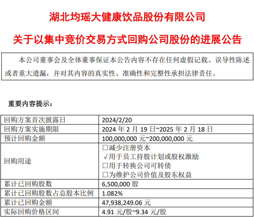 近期,湖北均瑶大健康饮品股份有限公司(下述简称“均瑶健康”)发布了回购公司股份的进展公告。