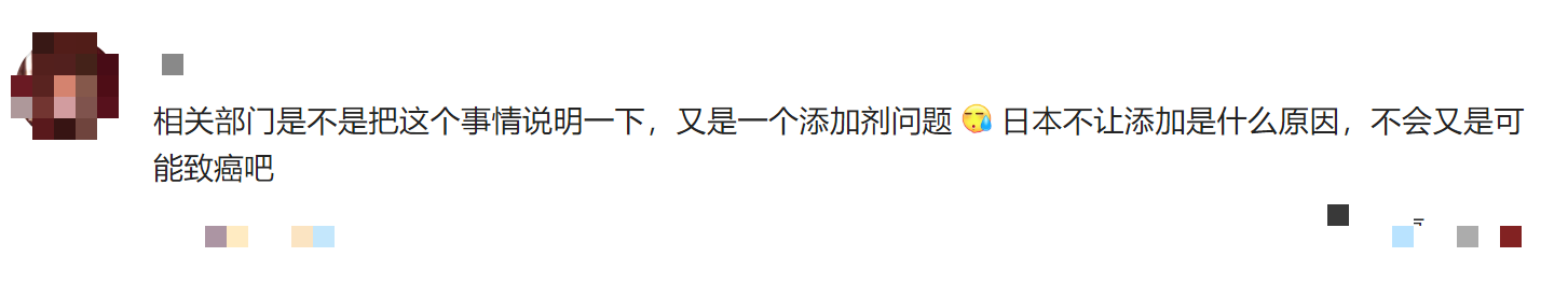 但此事却仍旧引起网友的议论纷纷。有网友在评论区称:“相关部门是不是把这个事情说明一下,又是一个添加剂问题,日本不让添加是什么原因,不会又是可能致癌吧”。