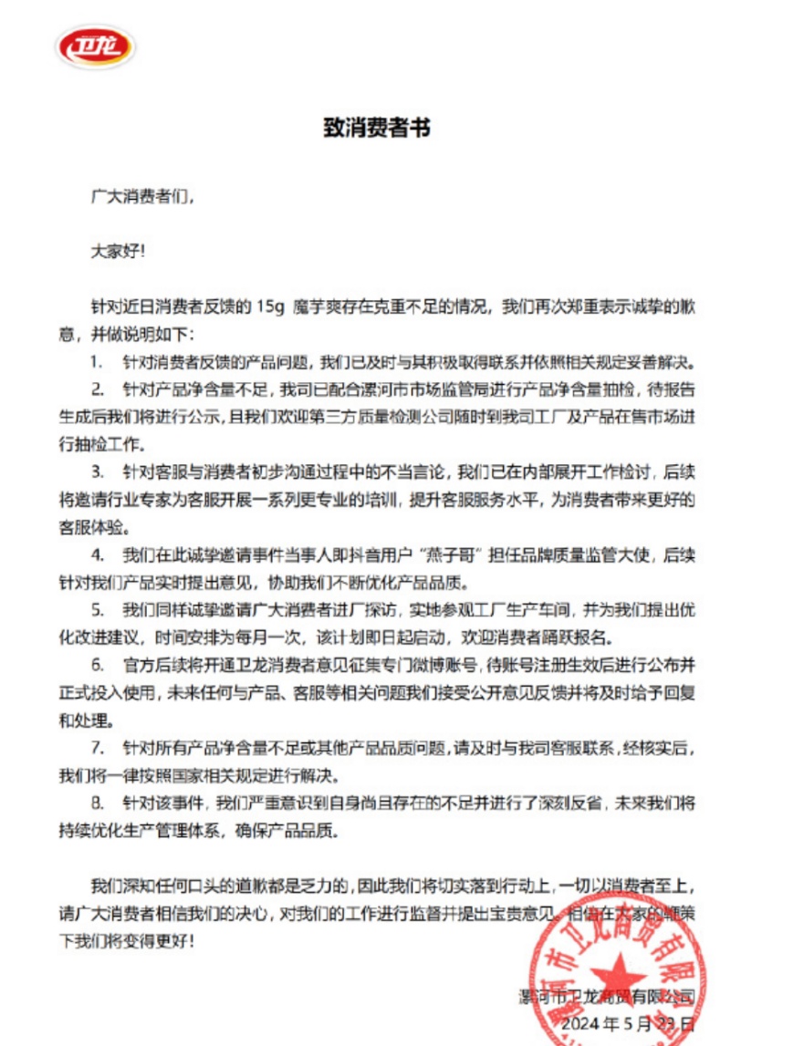 除了上述添加剂事件以外,今年5月卫龙美味还陷入产品质量风波—“缺斤少两”,5月20日,有抖音网友发布视频称“两包标称15克的卫龙魔芋爽,实际重量分别为12.6克和8.9克,均未达到15克”。