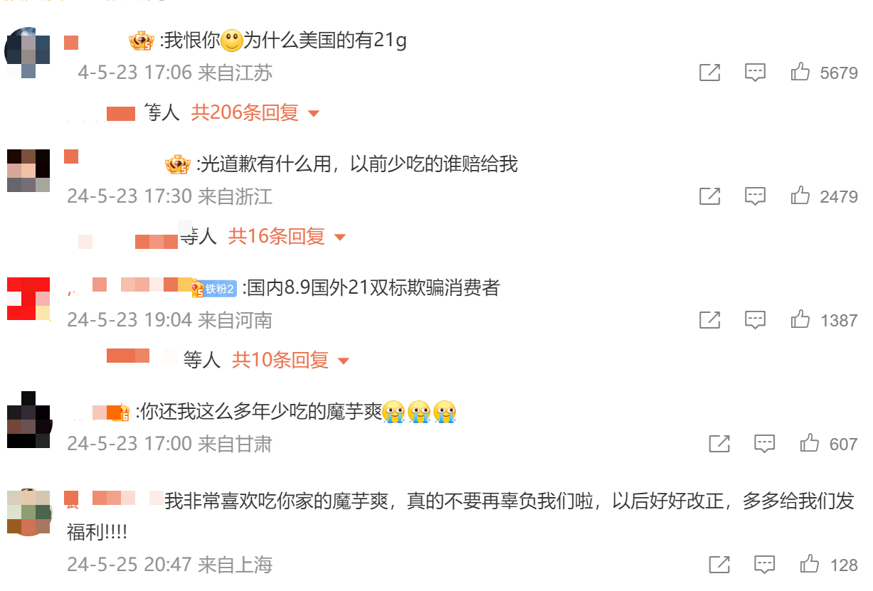 虽然卫龙美味已于5月23日发布《致消费者书》并真诚道歉,但在该条官微的评论区中仍旧有许多消费者表示不满“光道歉有什么用,以前少吃的谁赔给我?”