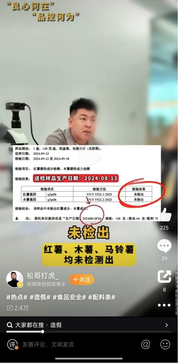 视频显示,该播主在良品铺子工作人员在场的情况下,向相关部门(某市场监督管理局)进行举报,并提供了关于良品铺子酸辣粉中粉丝包的送检报告。从视频中可以看到,检测结果显示粉丝并未检出红薯、木薯、马铃薯基因成分。