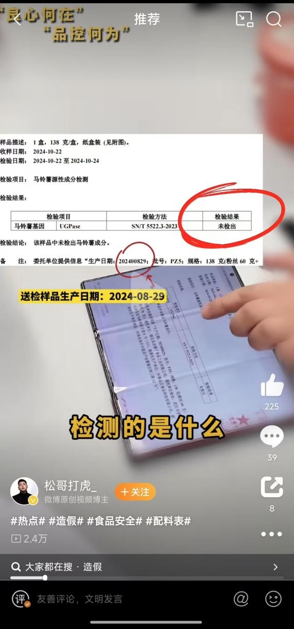 11月4日上午,该播主针对近期打假事件发布最新视频,其表示,良品铺子出示的一份检验报告是在7月21日,而不是播主认为有问题的7月1日之前的样品。据这份检验报告显示,送检样本名称为“桂香坚果藕粉”,收样日期是2024年7月21日,检验结论为“样品内参照基因检出,未检出木薯成分”。但另一份检测报告显示,送检日期是在6月13日,送检产品批次为2024-3-10,检验结论为:样品未检出小麦、红薯、木薯、玉米成分。