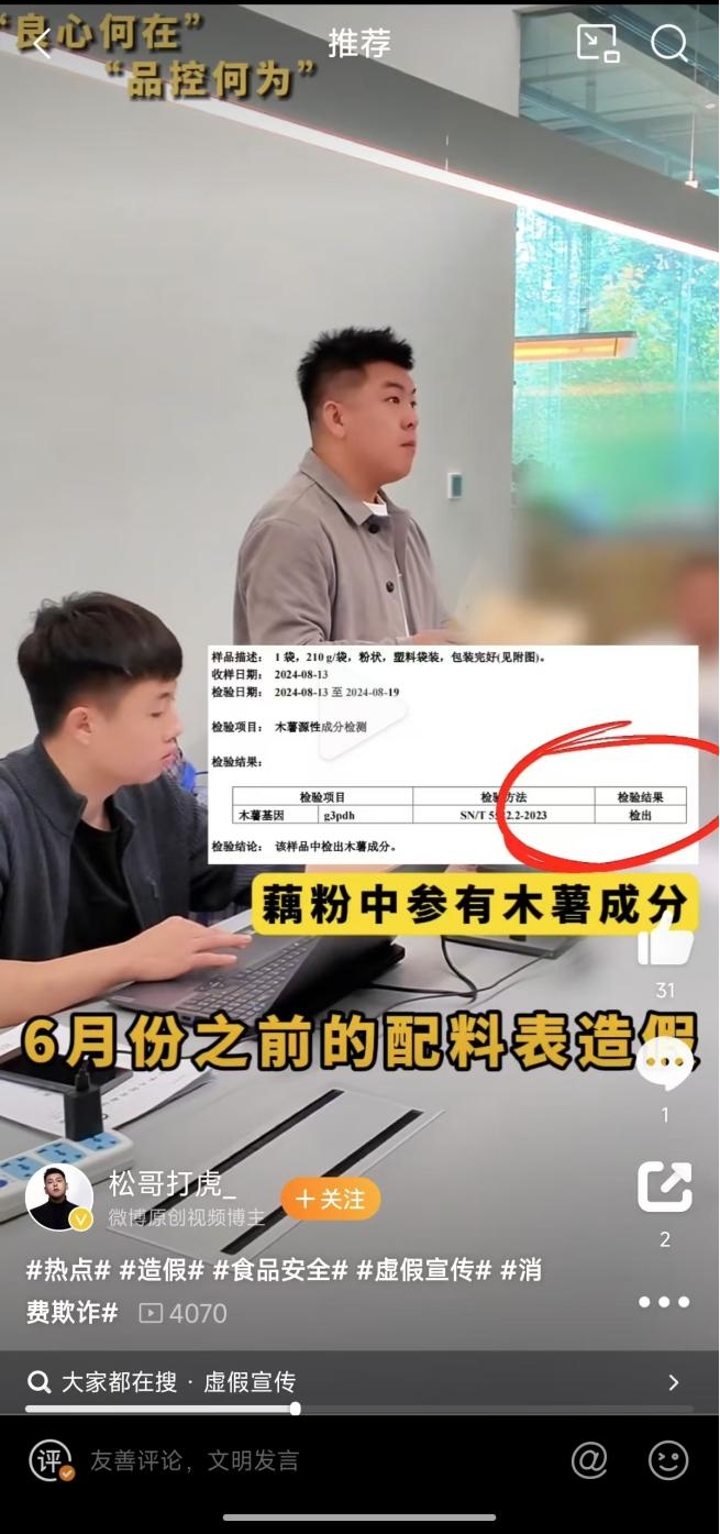 近日,打假博主“松哥打虎”发布视频显示,和“赏金猎人灰烬”一起打假良品铺子多款产品。视频提到“良品铺子产品配料表造假,酸辣粉里没有粉,藕粉掺杂木薯淀粉”等,这一消息迅速在网络上发酵,引发了网友的热议。