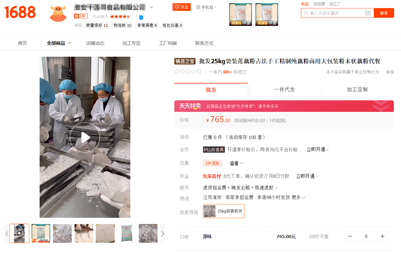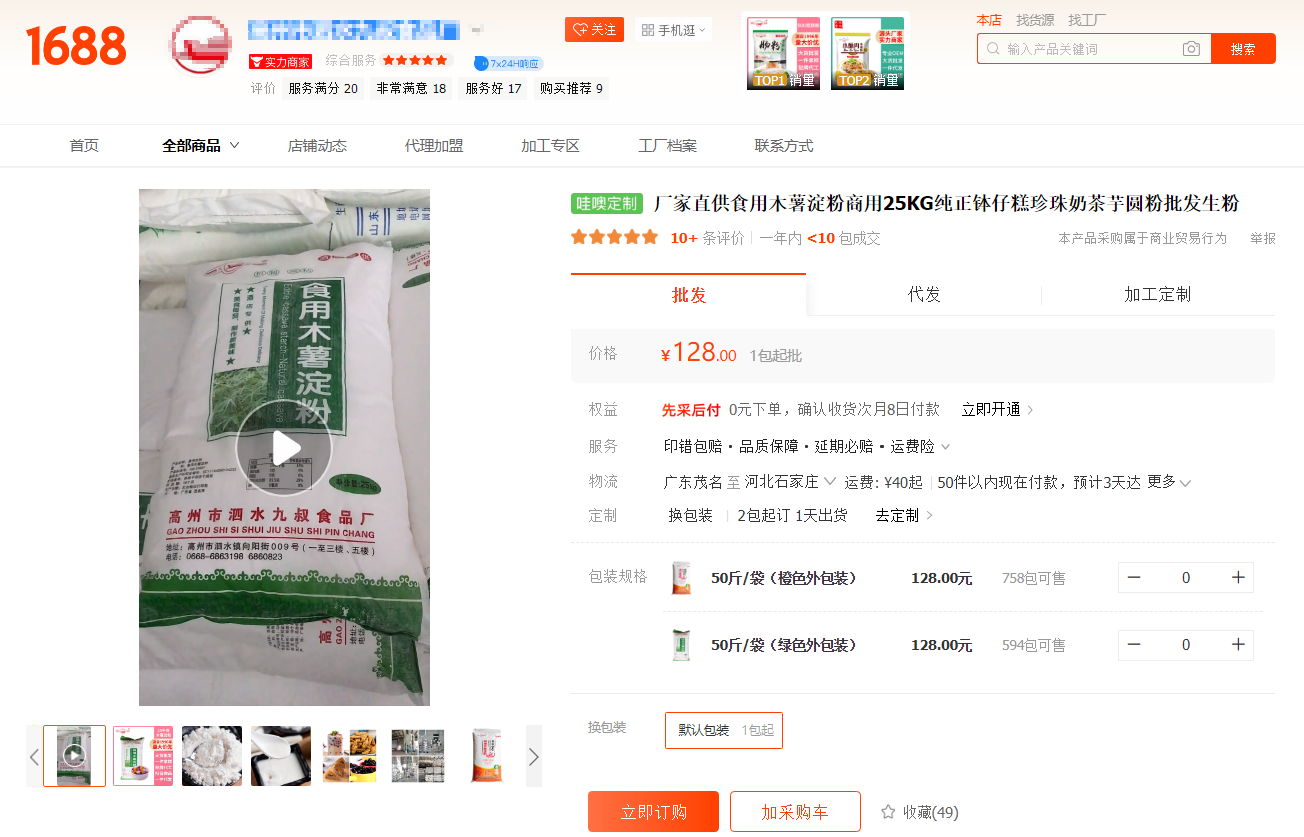 但二者价格相差甚远。在1688阿里巴巴采购批发网上,藕粉市场均价普遍较高。“批发25kg袋装莲藕粉古法手工精制纯藕粉”价格为765元,而一款同样重量的厂家直供食用木薯淀粉商用的价格仅有128元。