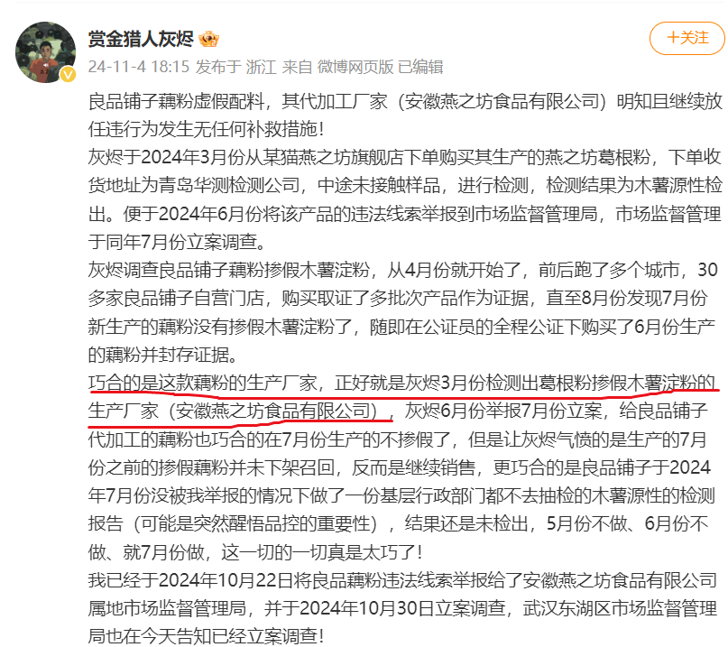 同时,打假博主“赏金猎人灰烬”于11月4日在微博账号中发文表示,上述良品铺子藕粉的代加工厂家(安徽燕之坊食品有限公司),是今年3月被检测出葛根粉掺假木薯淀粉的生产厂家。