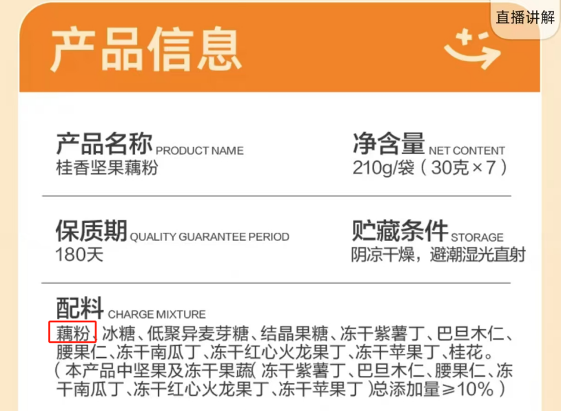 大公快消在良品铺子天猫旗舰店查询了酸辣粉、桂香坚果藕粉的配料表,粉丝配料里明确写明“食用木薯淀粉”、“红薯淀粉”,藕粉配料表中只提到“藕粉”,并未添加木薯成分。值得注意的是,目前在良品铺子天猫旗舰店仍能查到上述两种产品,但却显示“缺货”状态。