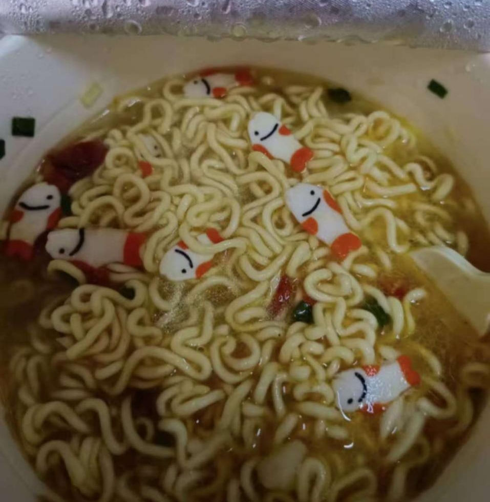 根据网友们爆料的产品实物图可以看到,剁椒鱼片汤面中的鱼片实际是Q版卡通小鱼模样的食品。