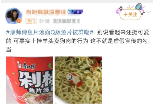 近日,康师傅方便面推出的新品“剁椒鱼片面汤”因Q版鱼片被群嘲,不少网友表示其宣传图和实物相差甚远,还有网友称这是“真‘鱼骗’”。
