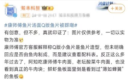 曾几何时,网友们曾吐槽康师傅红烧牛肉面里的肉丁太少、太小,如今,康师傅新品中的鱼片似乎已经开始“拟态而非求真”了。