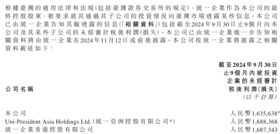 近日,统一企业中国发布了截至2024年9月30日止年度内公司及其某些子公司的未经审计税后利润(以下简称“税后利润”),其中统一企业中国实现税后利润约16.36亿元,同比增长约11.49%。