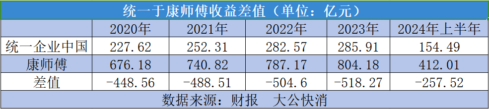 但不可否认的是,统一企业中国和康师傅之间的差距越来越大。以2020年-2023年以及2024年上半年的收益数据为例,两家公司的差值分别为448.56亿元、488.51亿元、504.6亿元、518.27亿元、257.52亿元。