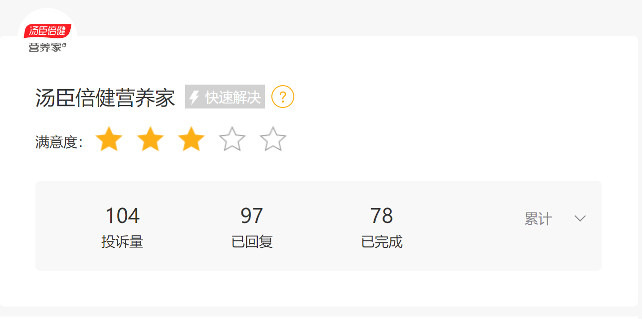 值得注意的是,据黑猫投诉平台显示,“汤臣倍健营养家”的累计投诉量为104条,已回复量为97条,已完成量为78条,满意度仅有3颗星。