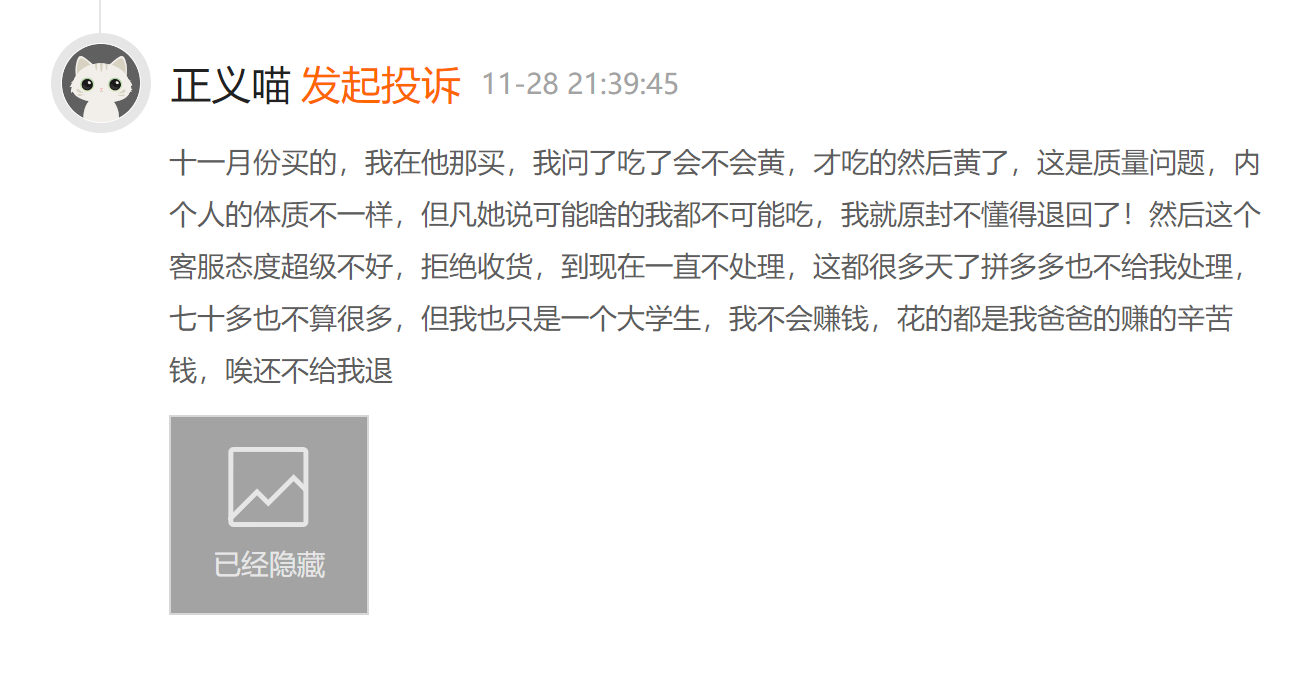 据该消费者称:“十一月份买的,我在他那买,我问了吃了会不会黄,才吃的然后黄了,这是质量问题,每个人的体质不一样,但凡她说可能我都不可能吃,我就原封不动地退回了!”
