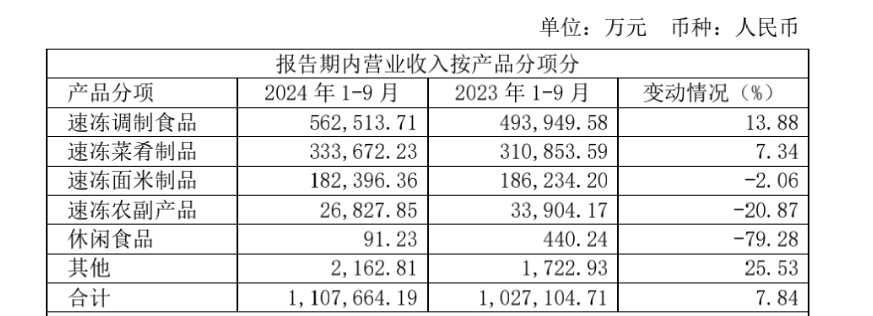 公告显示,安井食品2024年前三季度实现营业收入不到110.8亿元,同比增加约为7.84%;归属于上市公司股东的净利润约为10.47亿元,同比下降约为6.65%。