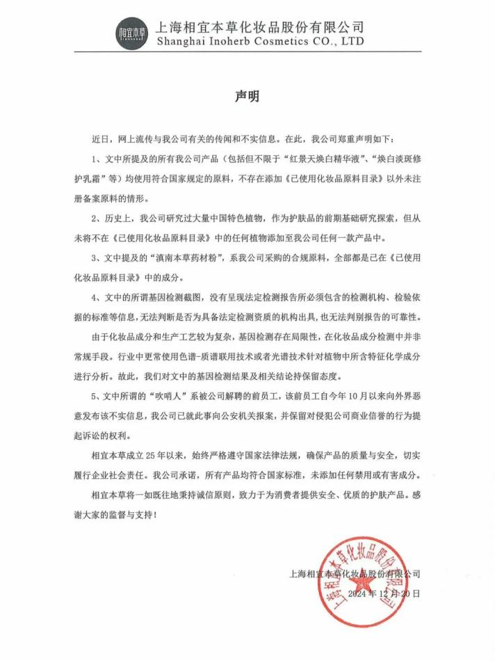 此外,相宜本草还表示,“所谓的‘吹哨人’系被公司解聘的前员工,该前员工自今年10月以来向外界恶意发布该不实信息,公司当时已就此事向公安机关报案。我们也将保留对侵犯公司商业信誉的行为提起诉讼的权利”。