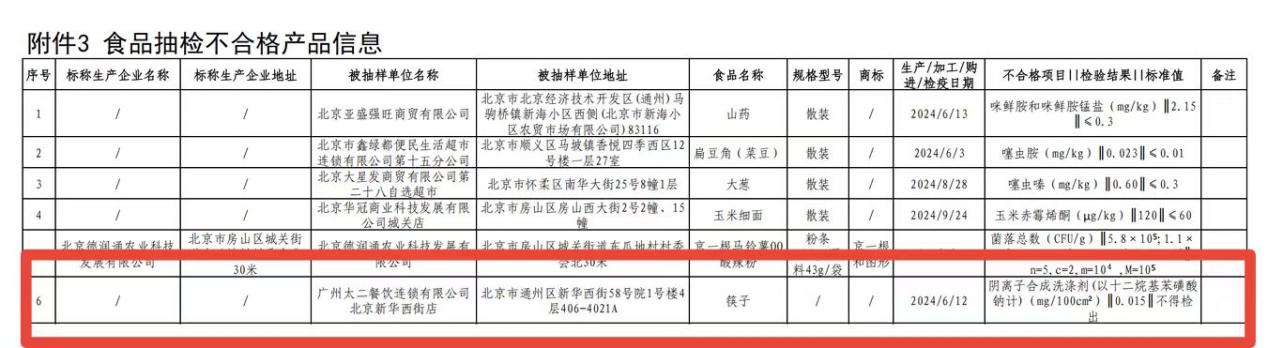 据食品抽检不合格产品信息显示,广州太二餐饮连锁有限公司北京新华西街店此次被通报,原因是在该店的筷子上检测出了阴离子合成洗涤剂(以十二烷基苯磺酸钠计)。