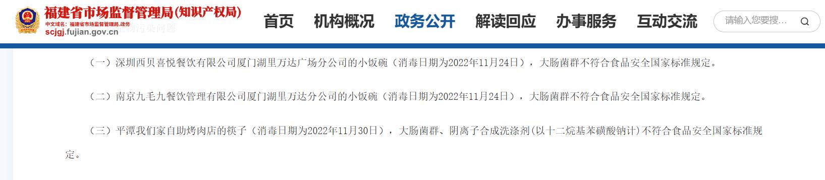 2023年2月,福建省市场监督管理局发布的2023年第6期食品安全监督抽检通告中,南京九毛九餐饮管理有限公司厦门湖里万达分公司(店铺名:太二酸菜鱼湖里万达店)的筷子被检出阴离子合成洗涤剂、大肠菌群,标准规定为不得检出;小饭碗被检出大肠菌群,标准规定为不得检出。