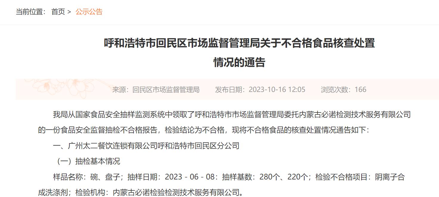 2023年,呼和浩特市回民区市场监督管理局发布公告,广州太二餐饮连锁有限公司呼和浩特市回民区分公司的碗、盘子均被检测出阴离子合成洗涤剂。