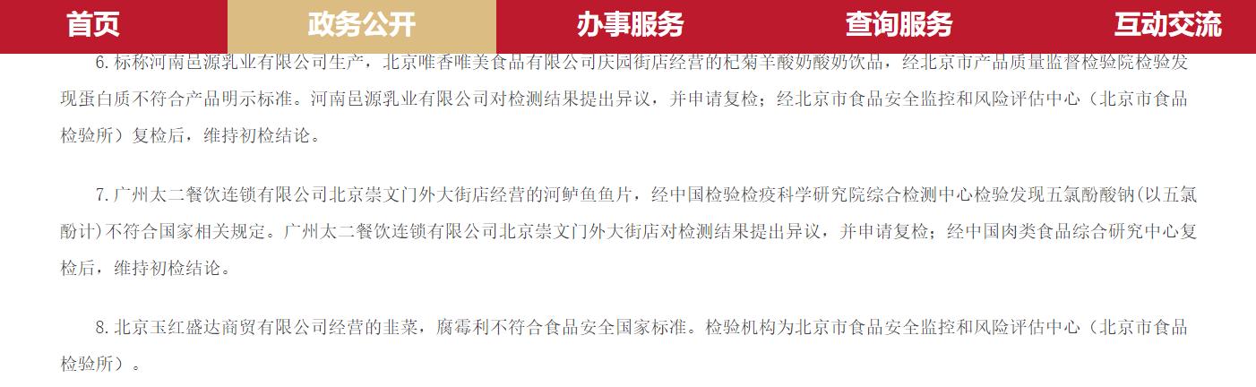 公告显示,北京市市场监督管理局日前对淀粉及淀粉制品、调味品、婴幼儿配方食品、特殊膳食食品、粮食加工品、乳制品、食用农产品、方便食品、餐饮具共552批次进行抽检。依据食品安全国家标准及国家有关规定进行检验和判定,合格546批次,不合格6批次。其中,广州太二餐饮连锁有限公司北京新华西街店位列抽检不合格的名单。