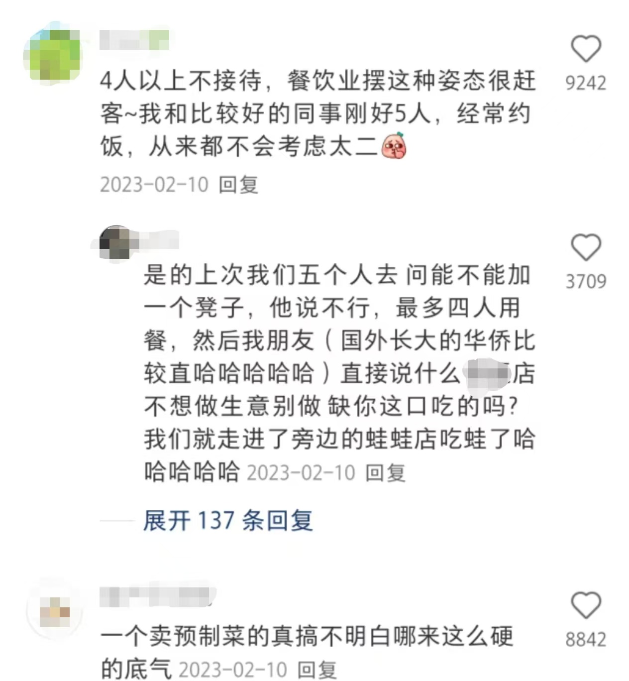 有网友曾在小红书评论区表示:“4人以上不接待,餐饮业摆这种姿态很赶客,我和比较好的同事刚好5人,经常约饭,从来都不会考虑太二。”