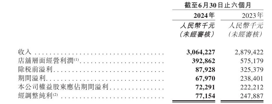 2024年8月23日,九毛九发布2024年上半年财报。上半年,九毛九实现营业收入约30.64亿元,同比增加6.42%。本公司权益股东应占期间溢利约7229.1万元,同比减少67.47%;经调整纯利约7715.4万元,同比减少68.88%。