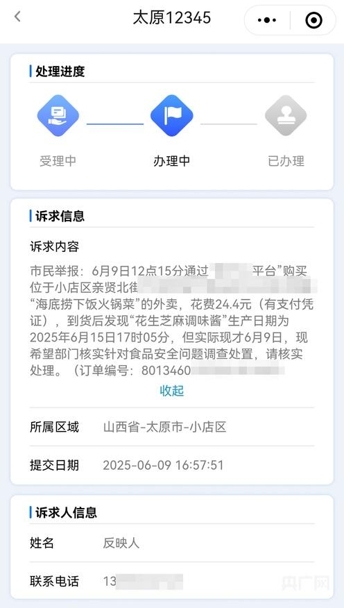 据央广网报道,6月9日,一消费者花费24.4元通过外卖平台在太原市小店区某商场的海底捞购买了“捞派豆花干拌麻辣烫套餐”。根据该消费者提供的图片显示,该份麻酱的分装日期显示为:2025年6月15日17:05。出品时效为24小时,使用方法为开封即食。当天,该消费者通过太原12345热线反映上述问题。