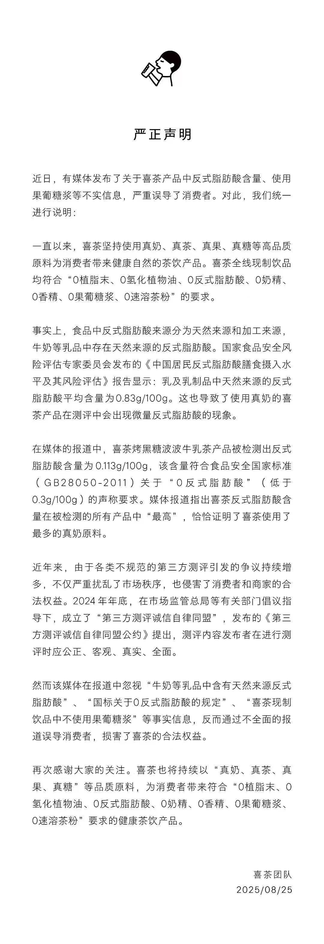 对于这一情况,喜茶于2025年8月25日发表声明称,喜茶烤黑糖波波牛乳茶产品被检测出的反式脂肪酸含量为0.113g/100g,该含量符合食品安全国家标准(GB28050-2011)关于“0反式脂肪酸”(低于0.3g/100g)的声称要求。媒体报道指出喜茶反式脂肪酸含量被检测的所有产品中“最高”,恰恰证明了喜茶使用了最多的真奶原料。