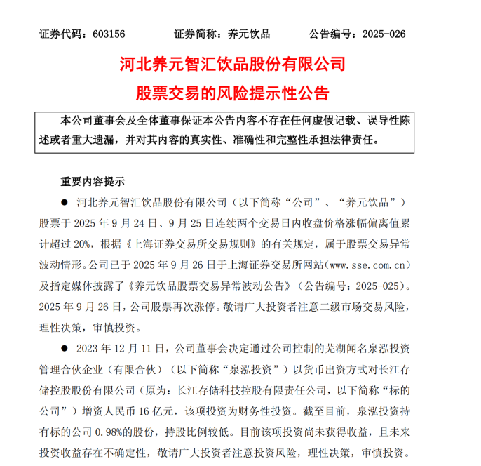 面对市场热炒,养元饮品紧急发布风险提示,坦言对长江存储控股有限责任公司(下称“长控集团”)的投资“尚未获得收益,未来收益不确定”,且明确表示此举仅为财务投资,不参与经营、无业务协同。而对于市场猜测的跨界转型方面却并没有任何解释。