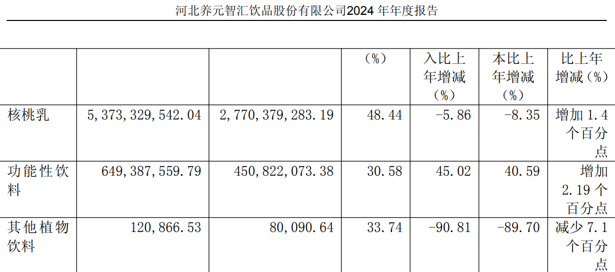 财报显示,养元饮品2024年核桃乳仍贡献53.7亿元的营收,占总营收比例大致为89.20%,而功能性饮料、枸杞饮品等新品的营收占比刚过10%,多元化尝试收效甚微。