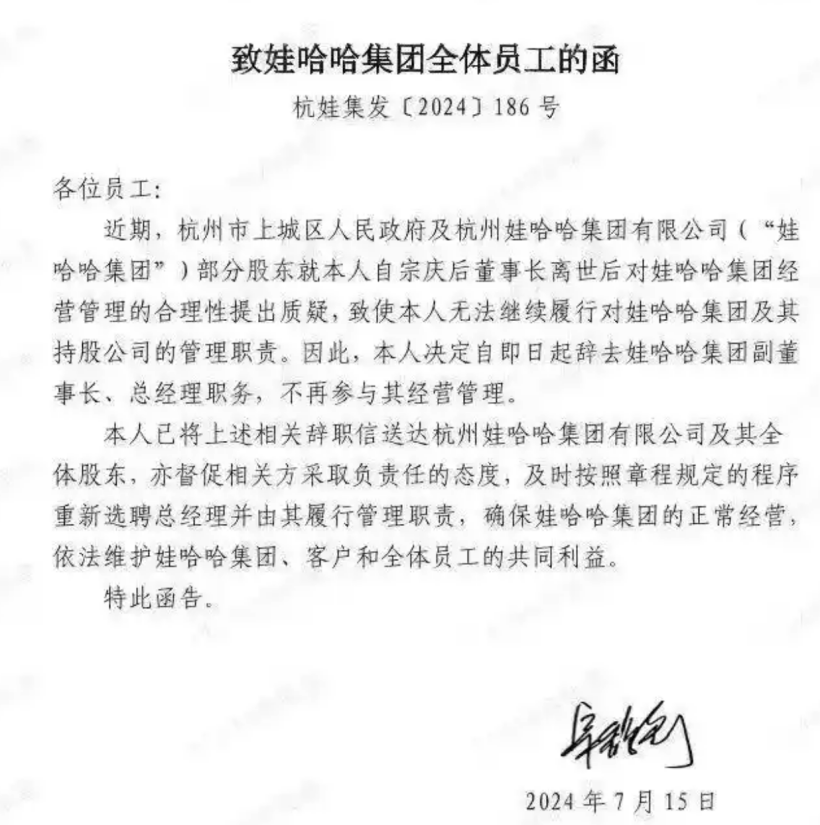 娃哈哈方面表示这是家族内部事务,与公司运营及业务并无关联,不会提供任何答复口径或相关回应。