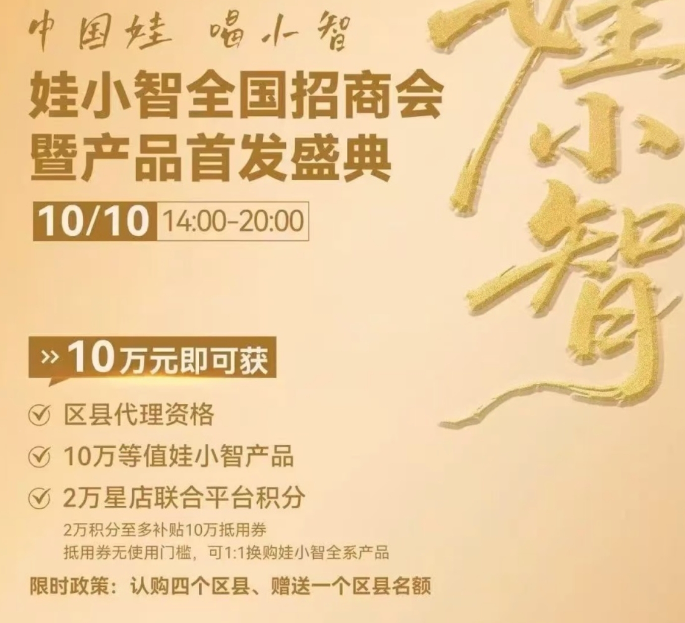 虽然招商海报显示的是“购买‘娃小智’产品10万元以上即可获得该区域独家经销商资格”。但“娃小智”相关招商人员表示,“娃小智”品牌从2024年11月开始运作,“我们从国庆节前后开始做娃小智,这边属于宗氏家族,就是宗泽后这边,相当于我们要和宗馥莉一起竞争市场。目前成为代理没有保证金,首次拿货不低于3万块钱就可以了。”