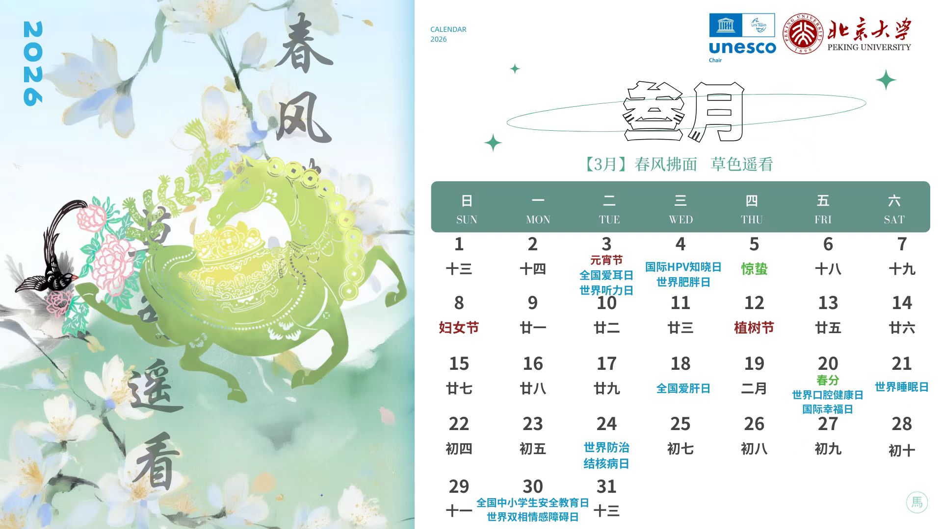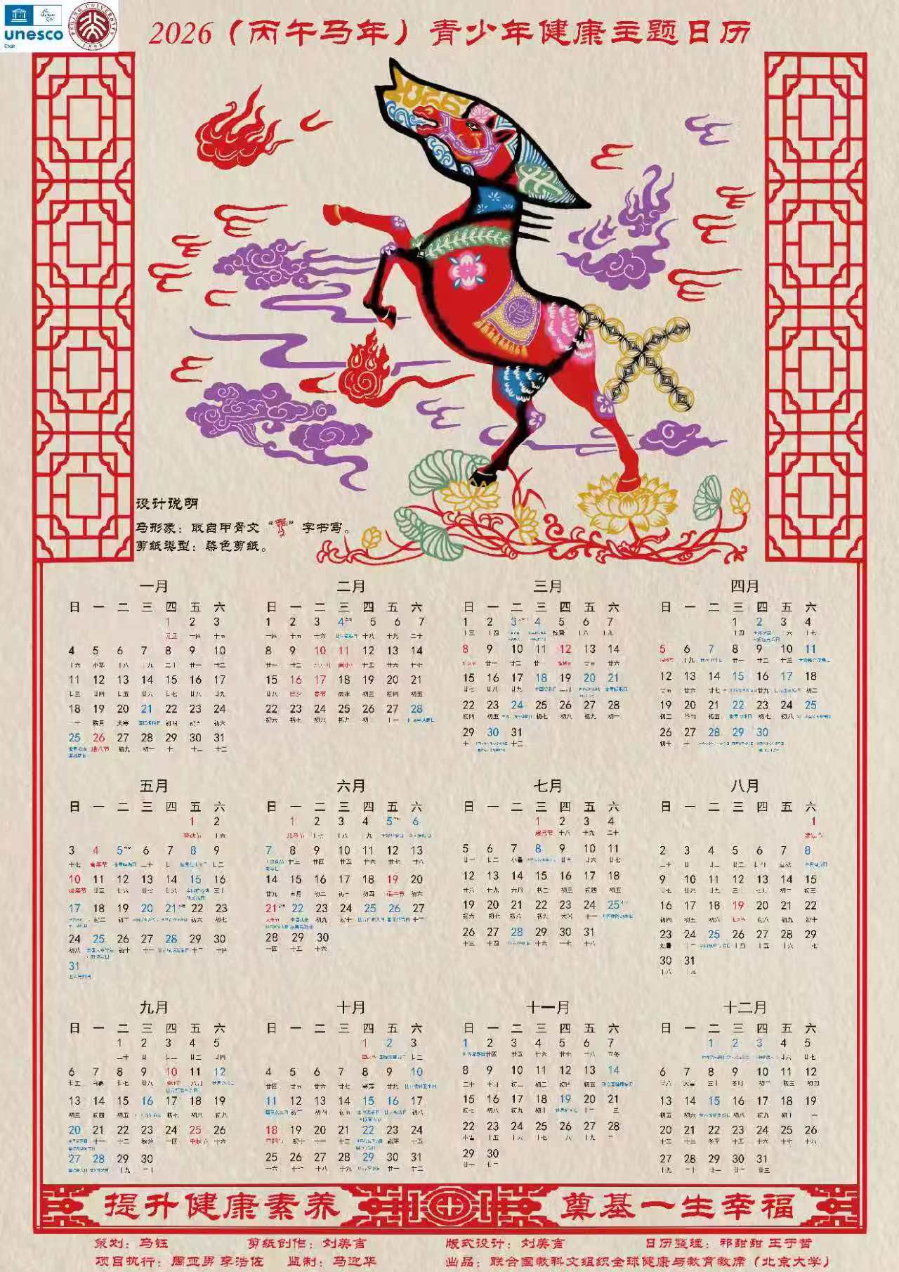 2026丙午马年,联合国教科文组织全球健康与教育教席(北京大学)正式推出全年版和逐月节气版青少年健康主题日历。据悉,自2023癸卯兔年以来,青少年健康主题日历已连续推出四年。