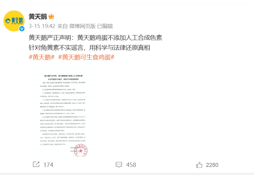 3月16日凌晨,黄天鹅再发微博称已发律师函,指“含人工合成色素”为不实信息,将采取法律行动;中午发文三问中国食品安全报社,直指报道有混淆概念、未求证企业、未核实检测标准等问题。当晚,黄天鹅创始人冯斌直播,重申未添加人工合成角黄素,承诺开放农场溯源,推进鸡蛋颜色相关标准建设。