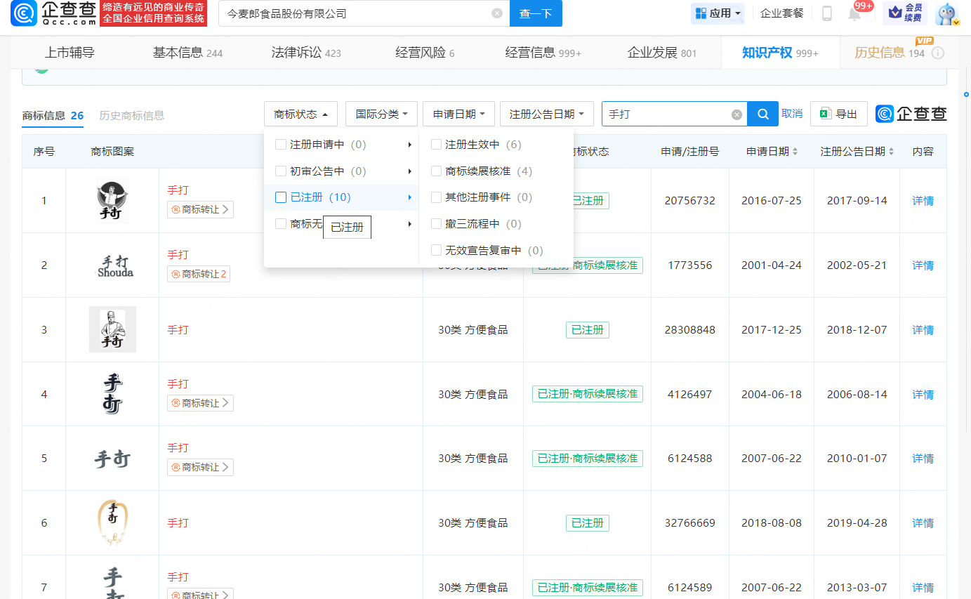 通过企查查也可以看到,今麦郎食品旗下共有26个商标名称为“手打”,其中有10个商标显示“已注册”,部分被转让的商标受让人也与今麦郎有着千丝万缕的关系,比如今麦郎面品有限公司、华龙日清食品有限公司(现存名今麦郎实业有限公司)等。