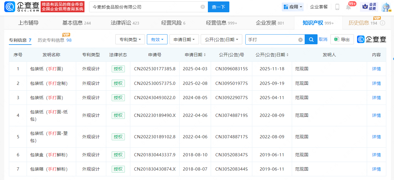 除了商标以外,今麦郎食品旗下四百余个有效专利中,有7个专利发明名称包含手打二字,其中涉及手打面、手打定制等产品的包装纸、包装盒等。