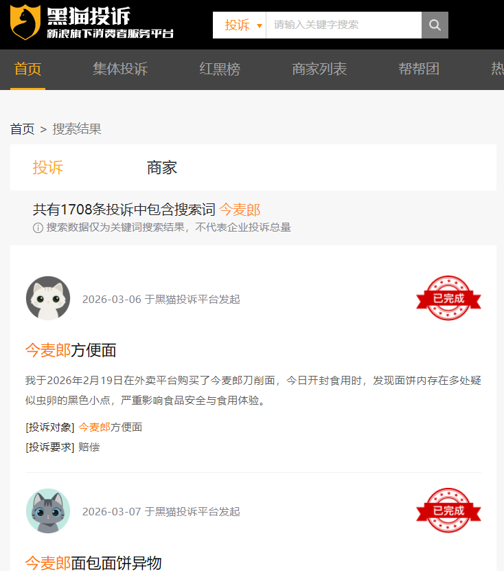 “手打”商标争议并非孤立事件,今麦郎近年来产品质量问题频发,食品安全投诉居高不下,成为企业发展的重大隐患。据黑猫投诉平台数据显示,截至2026年4月3日,涉及今麦郎的消费者投诉超1700条,其中包括面饼含虫卵、异物、变质、酸价超标等问题。