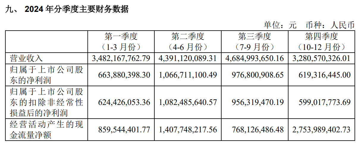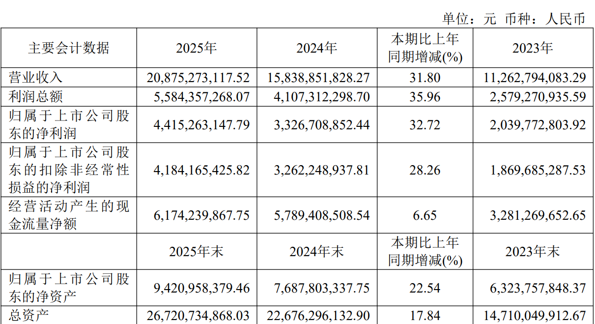 表面上,公司全年营收突破200亿元大关至约208.75亿元,同比增长约31.80%;归属于上市公司股东的净利润约44.15亿元,同比增长约32.72%,延续了近年“高增长”态势。但财报细节与单季度数据全面暴露增长隐忧:核心单品增速骤降、现金流严重背离、渠道返利透支未来、存贷双高风险凸显、低毛利新品拖累盈利。