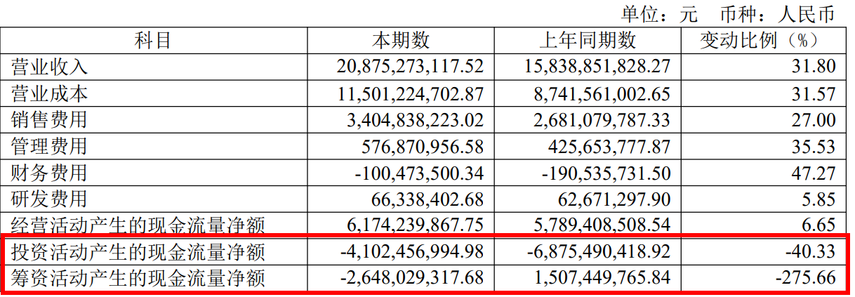 此外,虽然东鹏饮料2025年的总资产同比增长约17.8%至约267.21亿元,但其2025年投资现金流净额约-41.02亿元、筹资现金流净额约-26.48亿元,全年现金净流出约67.5亿元,货币资金增速远低于资产扩张速度,资金链承压。