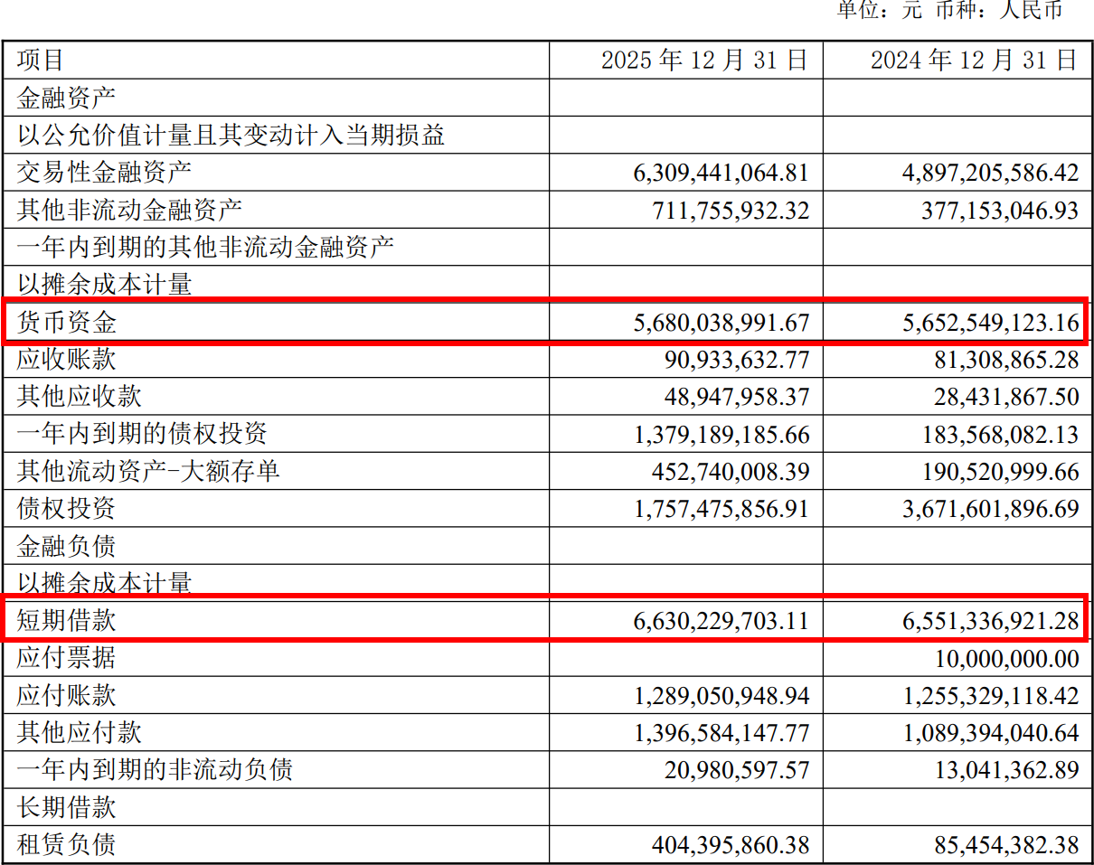 存贷双高,流动性风险爆錶。截至2025年末,东鹏饮料总资产约267.21亿元,总负债约172.97亿元,资产负债率达到约64.73%。一方面,账面货币资金约56.8亿元,另一方面,短期借款高达约66.3亿元,形成典型“存贷双高”格局。