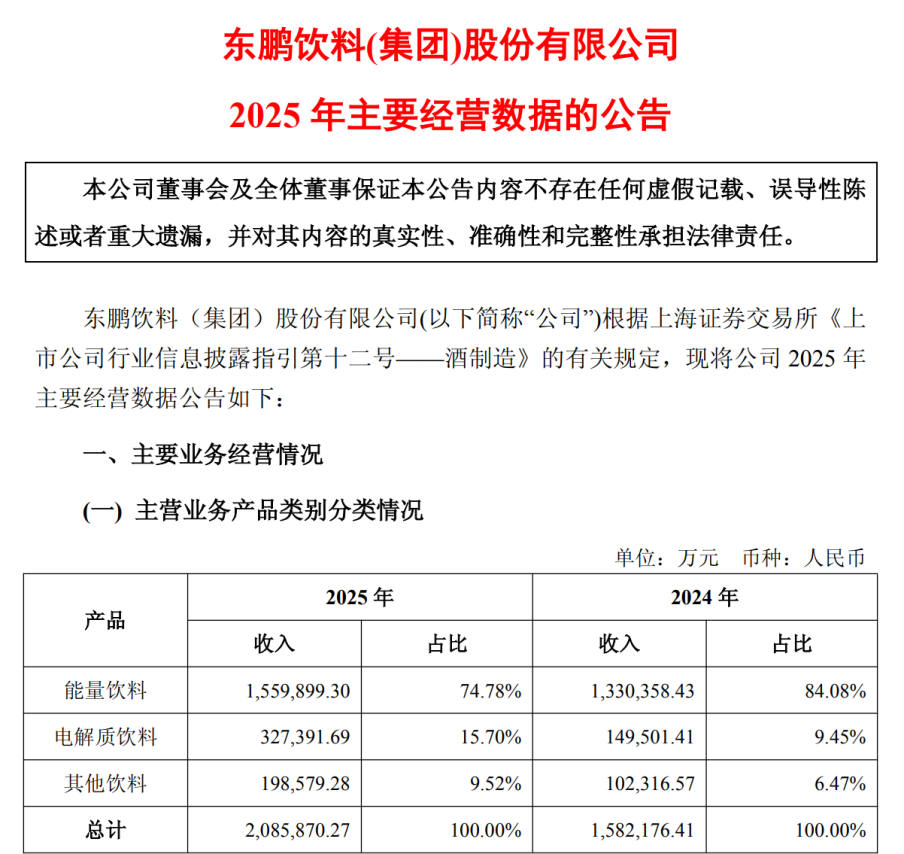 2026年3月30日,A股“功能饮料第一股”东鹏饮料(605499.SH)正式披露2025年全年财报。