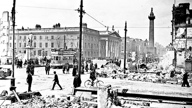 一九一六年四月二十三日,复活节星期日,仍处于英国殖民统治的爱尔兰爆发起义,一批爱国者趁英国忙于欧洲战事无暇西顾,率先在首都都柏林走上街头,大约上千人夺取了市内主要街区,并将起义总部设在了邮政总局(直到今天该大楼外墙仍可见当年的纍纍弹痕),起义军随后发表了宣布爱尔兰独立的《共和国宣言》。英国当局闻讯紧急调派军队前往镇压,近两万名英军包围了都柏林市中心并持续进行炮轰,起义军终因寡不敌众而战败,复活节起义仅坚持了六天便烟消云散。