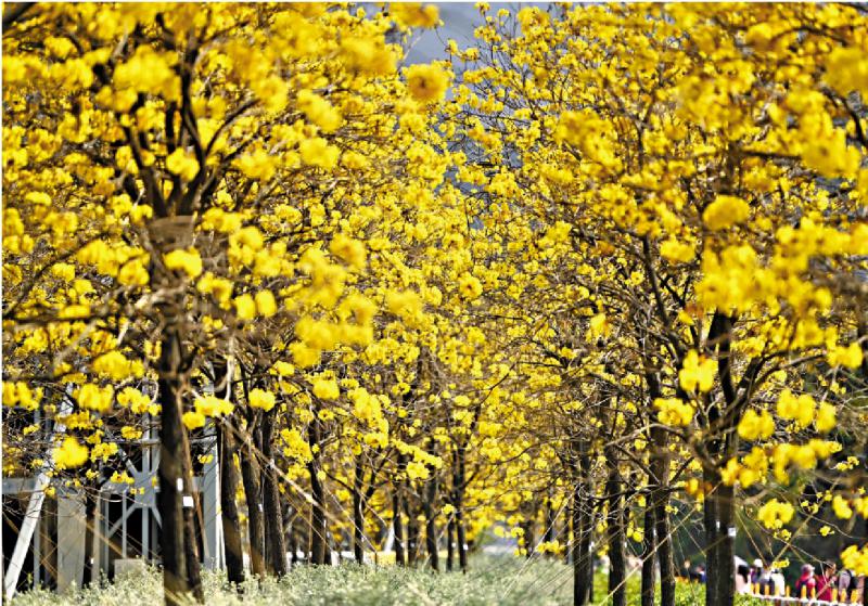 图:近日,东涌的黄花风铃木盛开,春意盎然。\中新社