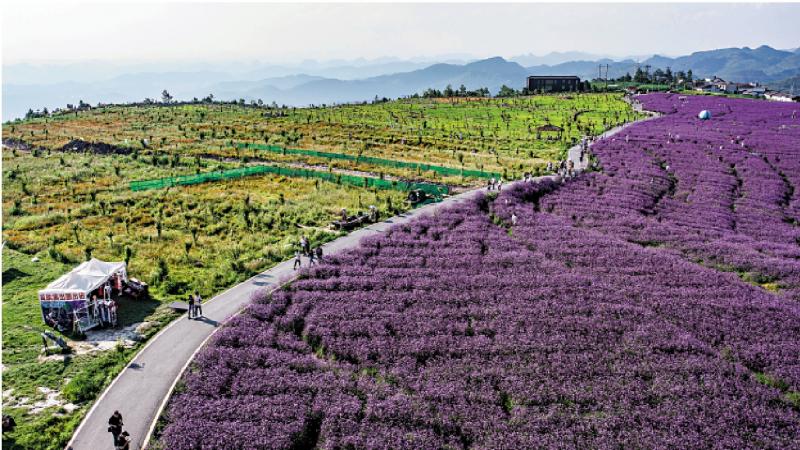 近日,贵州省贵阳市花溪区高坡苗族乡石门村的上百亩马鞭草盛开,吸引众多游客前来观赏游玩。
