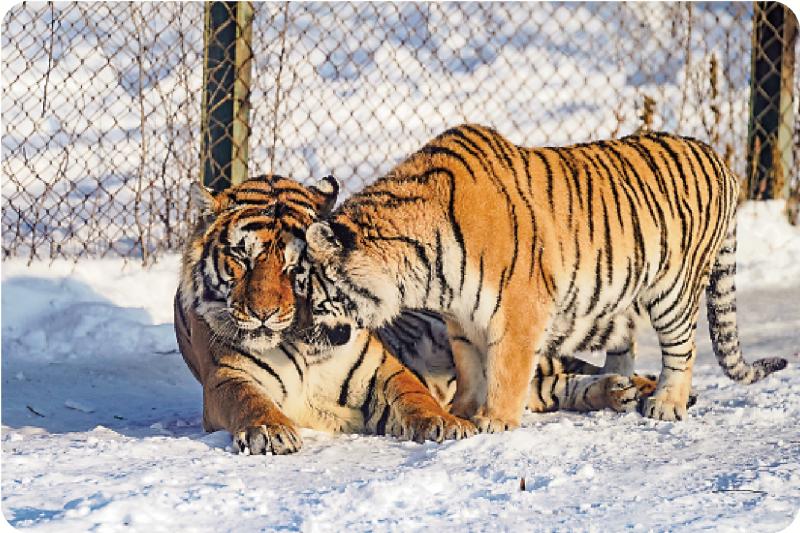 黑龙江省东北虎林园内,东北虎在雪地亲昵玩耍,萌态十足。中新社