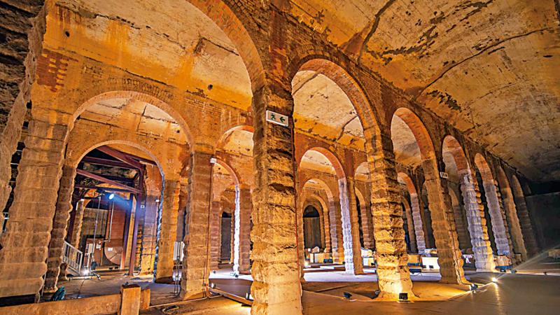由一百零八根石柱撑起、直径四十米、高九米的立体圆形水库,假如灌了水,就可游泳划艇,所以有人说它像罗马浴场,又酷似土耳其伊斯坦布尔的地下水库。但红砖的砌建是在水库哪里?走下工字铁搭起的楼梯由平顶一步步往下走,便见花岗岩石柱的顶部用红砖架构出半圆形的拱券,砖法排列是“欧式砌法”(Flemish Bond),俗叫“梅花丁”,是一种讲究强度的砌砖法。举头看见密密排列的拱券撑起了水泥平顶,才不怕有塌陷的危险。