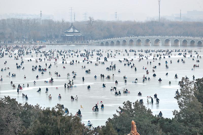 北京颐和园开启第十届冰上健体活动,昆明湖冰场正式迎客上冰。作为北京市公园管理中心“欢乐冰雪 快乐健身”名园冰雪游园会中冰场面积最大、承载量最多的户外天然冰场,颐和园冰场营业面积达到三十五万平方米,最大可以容纳五千人同时在冰面嬉戏。\中新社