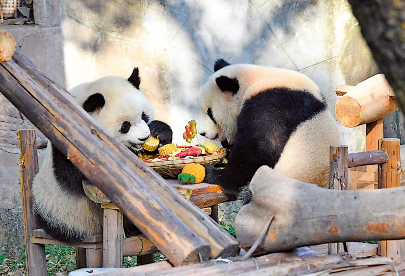 图:大熊猫“渝可”(右)“渝爱”(左)吃月饼庆中秋。